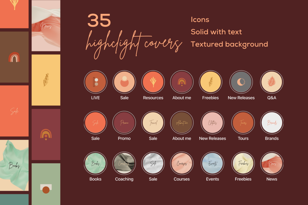 35 Instagram highlight covers (sized 1080px x 1080px)